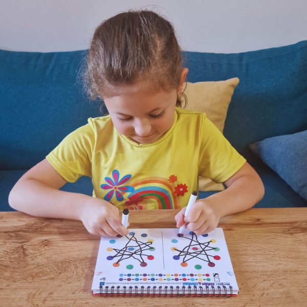 Książeczkę z laminowanymi stronami zawierającą 32 ćwiczenia dla mózgu, dzięki którym pomożesz swojemu dziecku rozwijać uwagę, koordynację, koncentrację oraz małą motorykę w zabawny sposób.