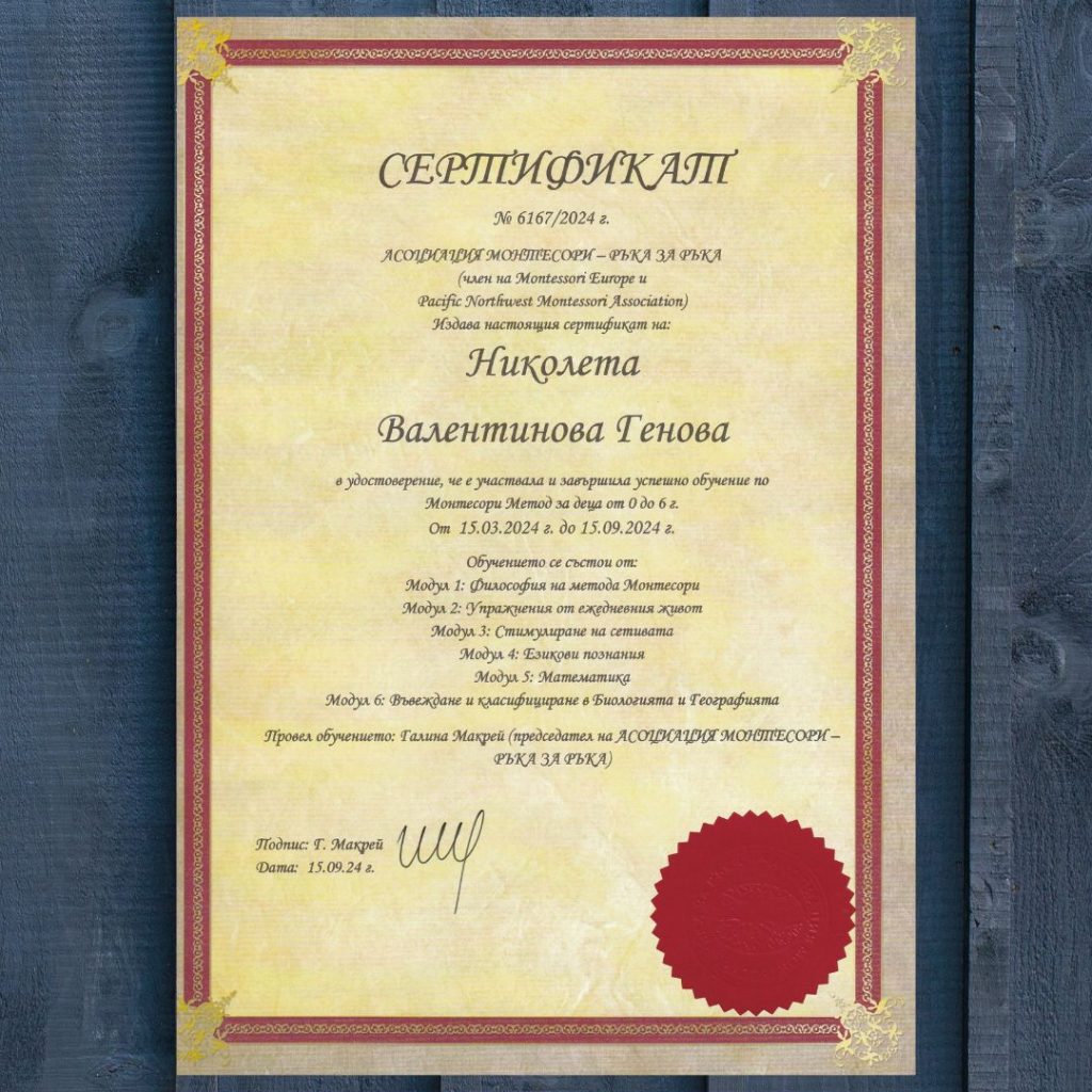 W dniu 15 września 2024 roku uzyskałam certyfikat nauczyciela Montessori dla dzieci w wieku od 0 do 6 lat, wydany przez Stowarzyszenie Montessori – Ręka w rękę.
