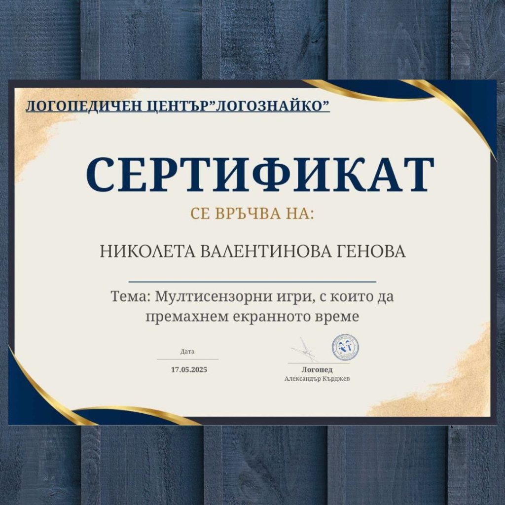 Dnia 17 maja 2025 roku z sukcesem ukończyłam specjalistyczne szkolenie prowadzone przez certyfikowanego logopedę z wieloletnim doświadczeniem – Aleksandara Kărdżewa z Centrum Logopedycznego „Logoznajko”.